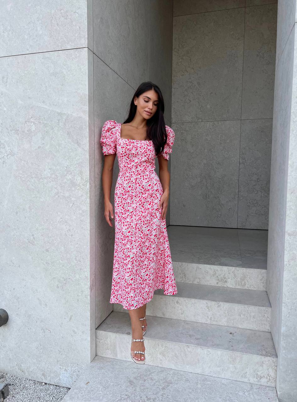 Midi-length dress with puff sleeves and a delicate floral print. A square neckline emphasizes the neckline and visually lengthens the neck. The model does not restrict movement and fits comfortably to the figure. The light and airy dress can be worn with either minimalist pumps or sandals.